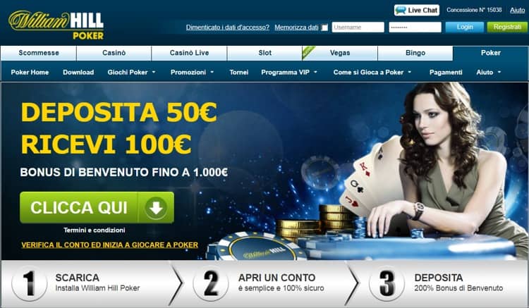 200% un Bonus di benvenuto - fino a 1.000€ sul tuo primo versamento. Questo significa che ricevi 100€ se versi nel tuo account un deposito di 50€. Per offrirti ancora di più, William Hill Poker ha sviluppato per te l'emozionante Area dedicata ai Nuovi Giocatori. In questa sezione speciale del sito hai la possibilità di approfittare di generosi premi e bonus di Poker del valore equivalente a oltre 7.000€ un'opportunità eccezionale per appagare appieno la tua voglia del miglior poker Italiano.