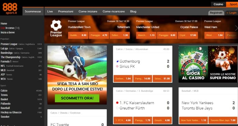Con migliaia di mercati su calcio, tennis, basket e su tutti gli sport più seguiti, 888sport è la casa delle scommesse sportive online. L’affidabilità e l’esperienza maturate dal brand 888 nel mondo del betting fanno di 888sport il bookmaker ideale per avere le migliori quote scommesse sportive, l’offerta più ampia di scommesse LIVE, ricchi bonus in regalo ogni giorno e la possibilità di giocare quando vuoi, dove vuoi, con le app per iOS e Android e un sito disegnato appositamente per scommettere da mobile.